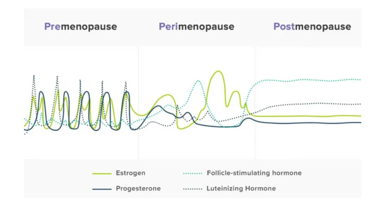 For women without a history of surgical menopause, I think of perimenopause as the years-long timeframe leading up to the last menstrual period when hormone production goes haywire. This graph is a nice visual. You can see that the hormone levels can be all over the place. This is why we don’t rely on blood testing to diagnose and treat perimenopause. Treatment is based on symptom management and the individual goals of the patient.